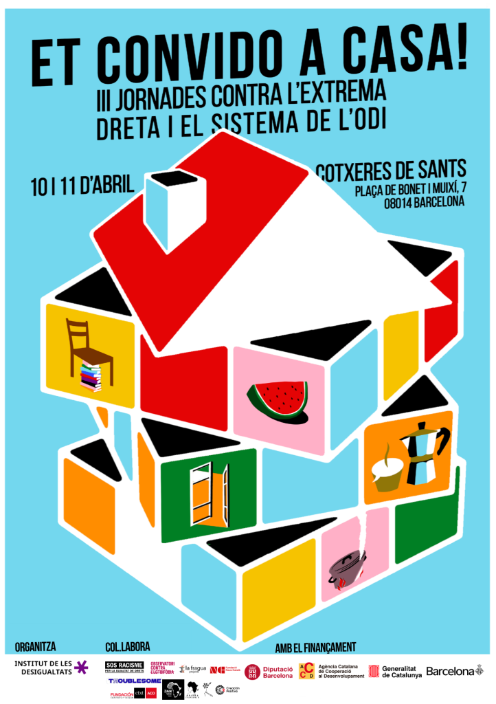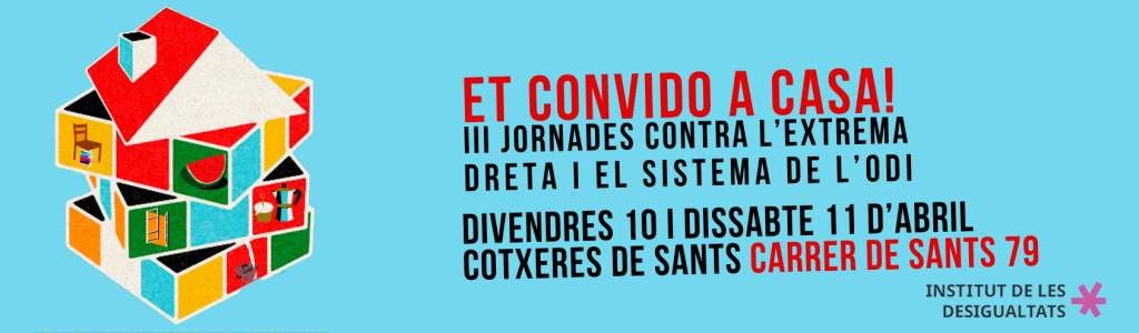 10:30h – 12:30h | Treballem juntes? Teixir xarxes contra l’Odi Creació de xarxa contra l’Odi. Entitats promotores: l’Institut de les Desigualtats, SOS Racisme, Fundación Contexto( Acción Contra el Odio) i La Fragua Project |